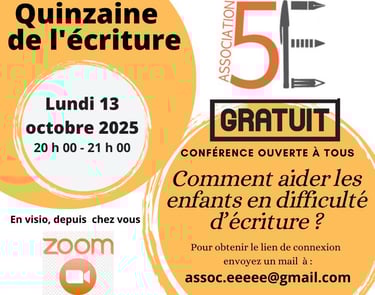 Conférence gratuite, en ligne, proposée par des graphopédagogues 5E, pour en savoir plus sur les aides possibles à apporter à des enfants en matière d'écriture