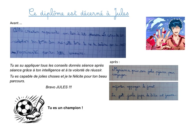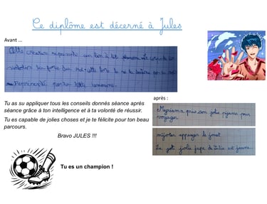 Nous travaillons également sur les stratégies de copie afin d'aider l'élève à copier plus efficacement, la vitesse d'écriture, sans oublier le renforcement du lien entre la lecture et l'écriture.