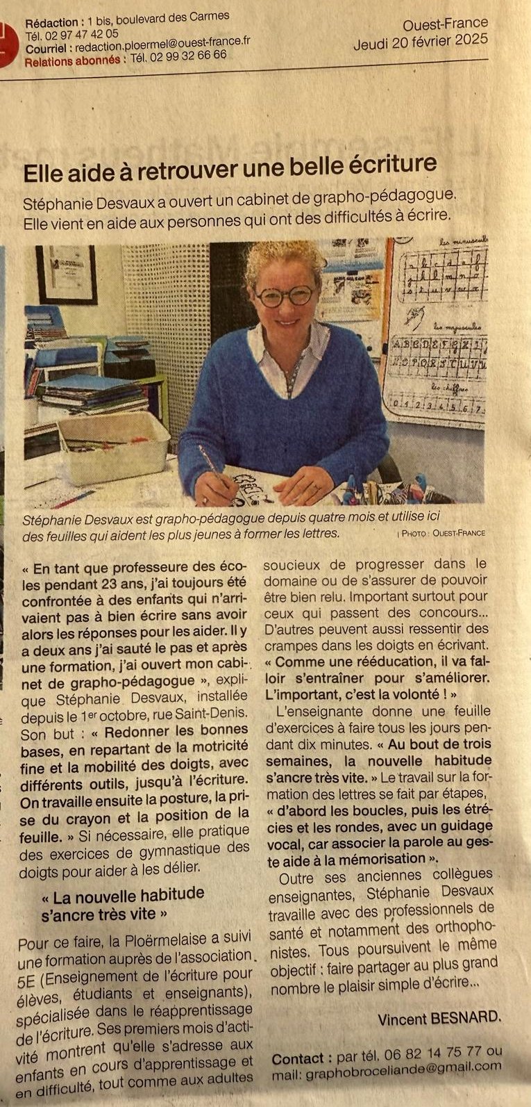 Un bel article sur le rôle et l'utilité de la graphopédagogie dans notre société : Grapho Brocéliande, Stéphanie DESVAUX, graphopédagogue à Ploërmel,